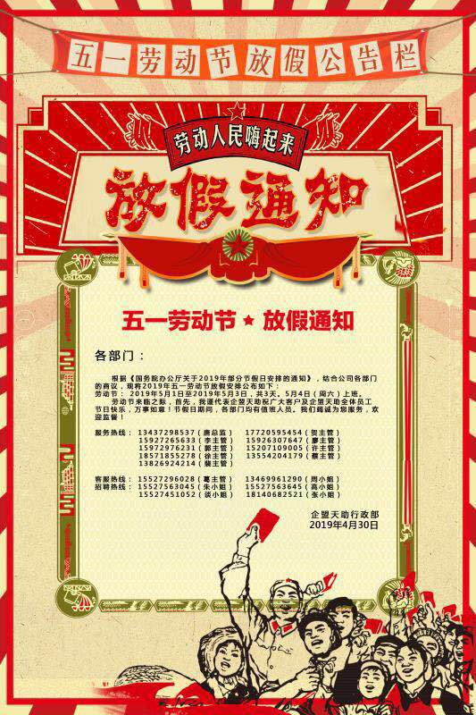 勞動(dòng)節(jié)來(lái)臨之際,首先,我謹(jǐn)代表企盟天助祝廣大客戶及企盟天助全體員工節(jié)日快樂,萬(wàn)事如意!節(jié)假日期間,各部門均有值班人員。我們竭誠(chéng)為您服務(wù),歡迎監(jiān)督!