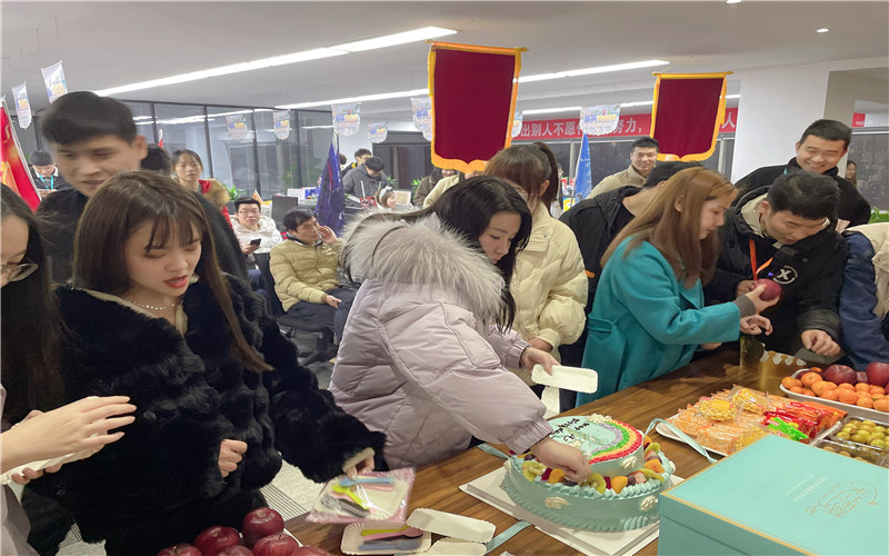 總結(jié)大會(huì)結(jié)束后,企盟天助的員工為壽星們唱生日歌,切生日蛋糕,共祝生日。