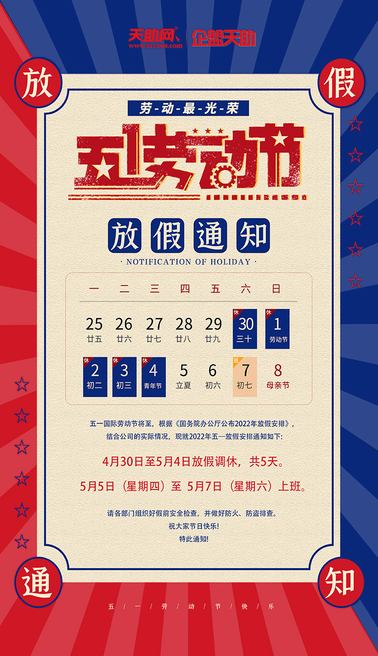 勞動(dòng)節(jié): 2022年4月30日至2022年5月4日,共5天。5月5日(星期四)至5月7號(星期六)上班。