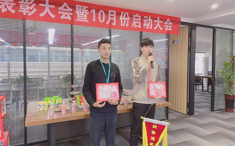 下面進(jìn)入頒獎(jiǎng)環(huán)節(jié)。經(jīng)過(guò)一個(gè)月精彩的角逐,我們的冠軍誕生了,是我們神鋒隊(duì)的張鋮;亞軍是我們超越隊(duì)的王東。由肖總頒發(fā)獎(jiǎng)項(xiàng)后,獲獎(jiǎng)?wù)甙l(fā)表了獲獎(jiǎng)感言。
