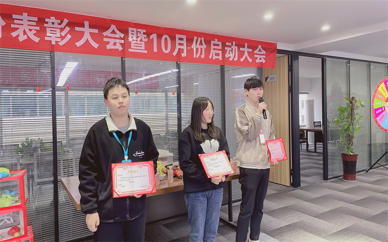 接下來(lái)我們頒發(fā)優(yōu)秀客服獎(jiǎng),獲獎(jiǎng)?wù)叻謩e為:第一名:馬小紅、第二名:孫晨晨、第三名:莊思雨。肖總為優(yōu)秀客服一一頒發(fā)獎(jiǎng)勵(lì)、獲獎(jiǎng)?wù)甙l(fā)表獲獎(jiǎng)感言。