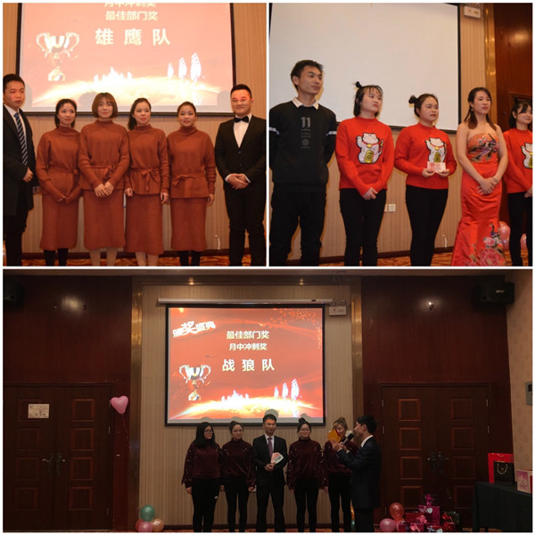 接下來我們頒發(fā)最佳部門獎(jiǎng),一月大家都很拼搏,掌聲有請(qǐng)我們冠軍團(tuán)隊(duì)--雄鷹隊(duì)獎(jiǎng)金(450元)獲得了月中沖刺獎(jiǎng)勵(lì)150元和最佳部門獎(jiǎng)勵(lì)300元,戰(zhàn)狼隊(duì)獎(jiǎng)金(350元)獲得了月中沖刺獎(jiǎng)勵(lì)150元和最佳部門獎(jiǎng)勵(lì)200元,王者隊(duì)獎(jiǎng)金(100元)獲得了最佳部門獎(jiǎng)勵(lì)100元,下面有請(qǐng)獲獎(jiǎng)?wù)甙l(fā)表獲獎(jiǎng)感言。