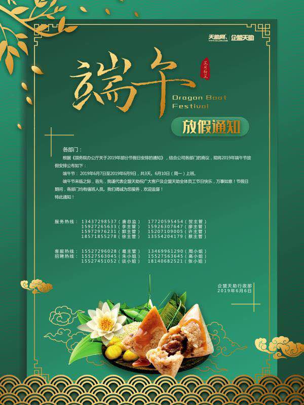 端午節(jié)來臨之際,首先,我謹(jǐn)代表企盟天助祝廣大客戶及企盟天助全體員工節(jié)日快樂,萬事如意!節(jié)假日期間,各部門均有值班人員。我們竭誠為您服務(wù),歡迎監(jiān)督!