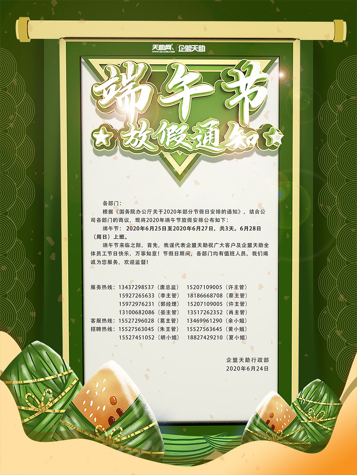 端午節(jié)來臨之際,首先,我謹(jǐn)代表企盟天助祝廣大客戶及企盟天助全體員工節(jié)日快樂,萬事如意!節(jié)假日期間,各部門均有值班人員。我們竭誠(chéng)為您服務(wù),歡迎監(jiān)督!