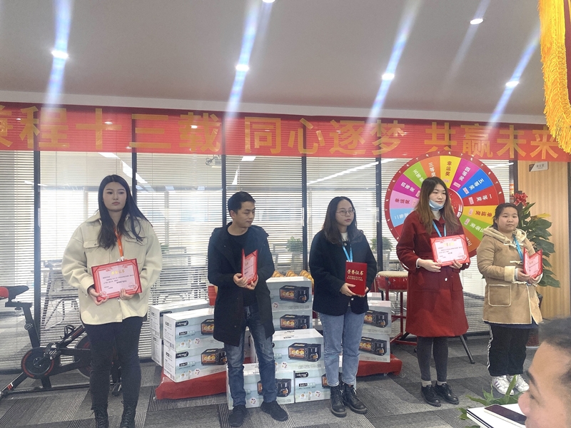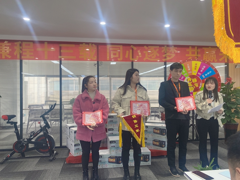 接下來頒發(fā)服務(wù)之星:夏靖富,技術(shù)之星;何蘭潔,最佳通話時長:蔣雙雙,邀約最多;徐輝,新客戶最多:龔美宇。