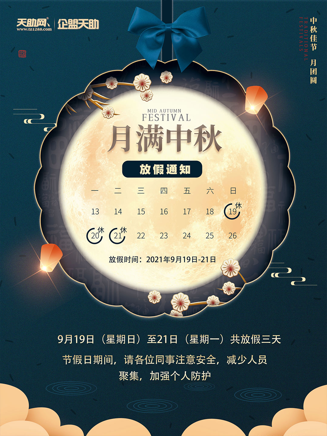 中秋節(jié):2021年9月19日至2021年9月21日,共3天。9月22日(周三)上班。