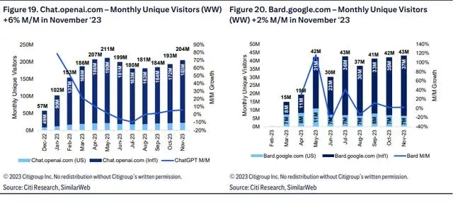 Google的Bard:Bard最近更新到Google最新的基礎(chǔ)模型Gemini上,目前已在230多個(gè)國(guó)家和地區(qū)上線,并且據(jù)SimilarWeb的數(shù)據(jù),月活用戶數(shù)量已達(dá)約4300萬(wàn)。我們認(rèn)為Bard是谷歌構(gòu)建更加交互式搜索體驗(yàn)(和網(wǎng)絡(luò))戰(zhàn)略的關(guān)鍵組成部分,并預(yù)計(jì)在2024年會(huì)有更多特定垂直領(lǐng)域的應(yīng)用案例,比如旅游、醫(yī)療和教育等。雖然目前ChatGPT市場(chǎng)份額比Bard更大,但我們認(rèn)為Bard和SGE(搜索生成式體驗(yàn))可至少能夠維持當(dāng)前的搜索市場(chǎng)份額。