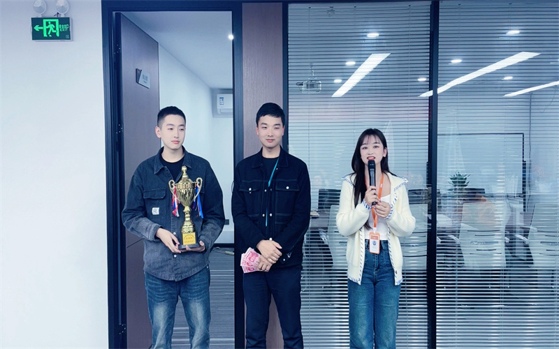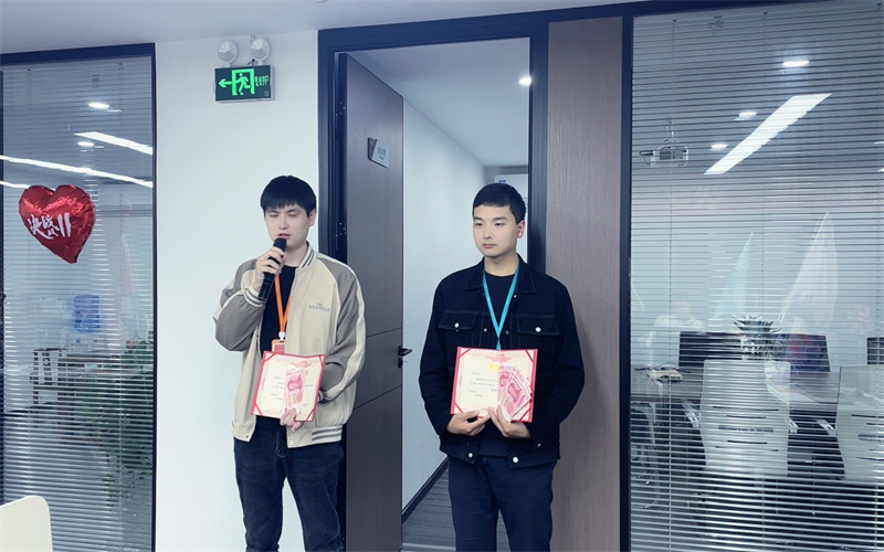 下面進(jìn)入頒獎(jiǎng)環(huán)節(jié)。經(jīng)過一個(gè)月精彩的角逐,我們的冠亞軍誕生了,冠軍是我們超越隊(duì)的王東,亞軍是神鋒隊(duì)的張鋮。由肖總頒發(fā)獎(jiǎng)項(xiàng)后,獲獎(jiǎng)?wù)甙l(fā)表了獲獎(jiǎng)感言。